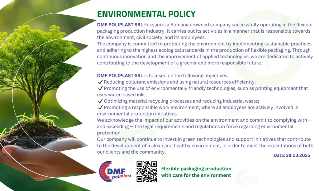 At DMF Poliplast, we are committed to producing flexible packaging that is not only high-performing but also environmentally friendly. Our environmental policy reflects the values we believe in: responsible innovation, reducing environmental impact, and actively contributing to a cleaner future.Discover the principles that guide us every day.
